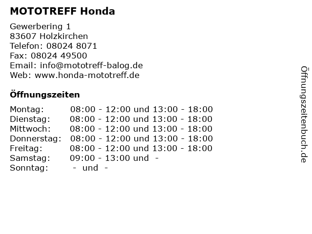 | Öffnungszeiten MOTOTREFF Honda in Holzkirchen anzeigen | |