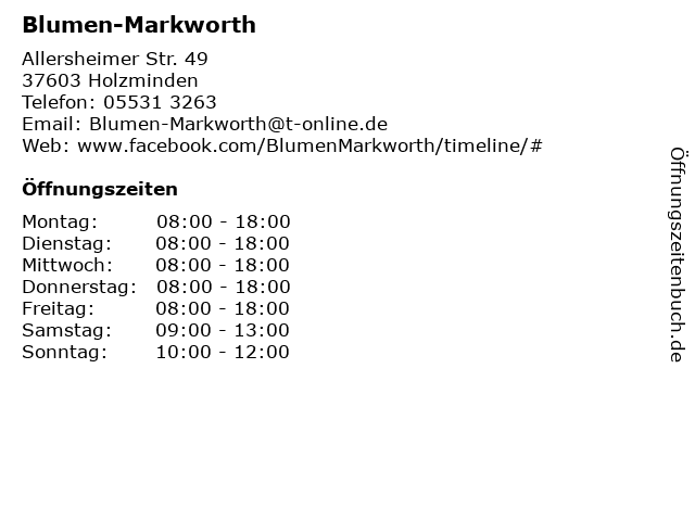 | Öffnungszeiten Blumen-Markworth in Holzminden anzeigen | |
