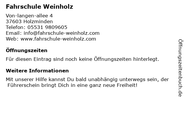 | Öffnungszeiten Fahrschule Weinholz in Holzminden anzeigen | |
