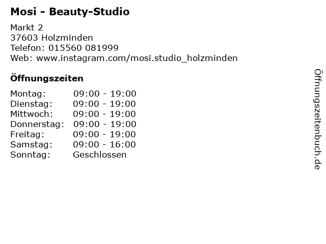 | Öffnungszeiten Mosi - Beauty-Studio in Holzminden anzeigen | |