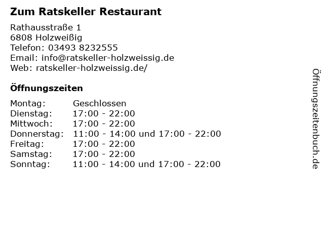 | Öffnungszeiten Zum Ratskeller Restaurant in Holzweißig anzeigen | |