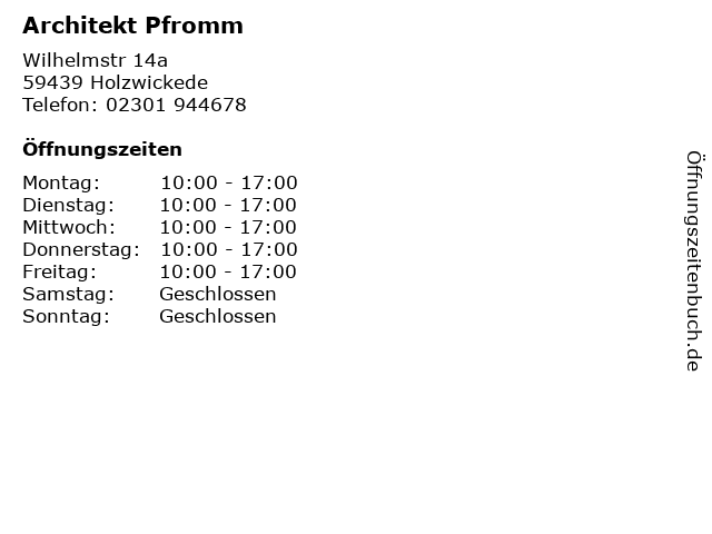 | Öffnungszeiten Architekt Pfromm in Holzwickede anzeigen | |