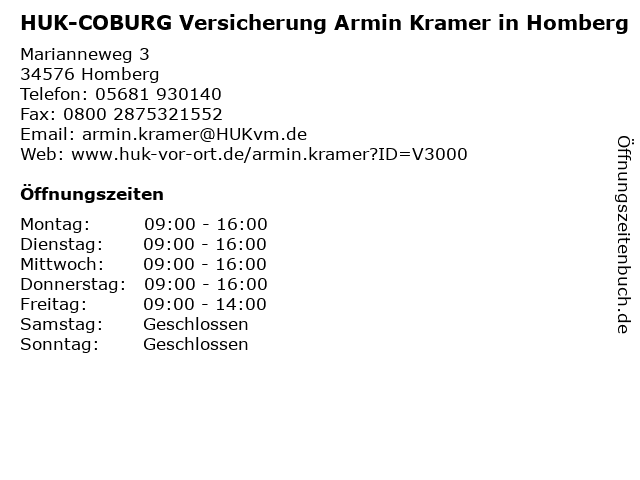 2 Uwe Kramer Grafikdesigner, Andrea Froneck-Kramer (Entfernung: 3,49 km) Forsthausstr. 11, 34576 Homberg 4 HUK-COBURG Versicherung Jana Norwig in Malsfeld - Mosheim (Entfernung: 8,08 km) Heiderosenstr. 2, 34323 Malsfeld 5 HUK-COBURG Versicherung Daniel Kräupl in Frielendorf - Todenhausen (Entfernung: 8,25 km) Ahornweg 10, 34621 Frielendorf 6 |