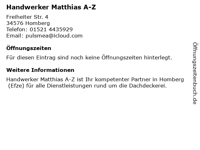 | Öffnungszeiten Handwerker Matthias A-Z in Homberg anzeigen | |