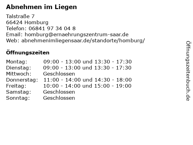 | Öffnungszeiten Abnehmen im Liegen in Homburg anzeigen | |