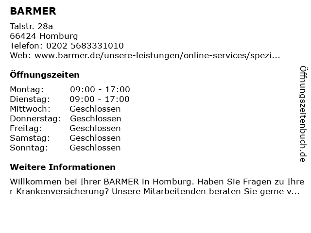 Hinweis: Willkommen bei Ihrer BARMER in Homburg. Haben Sie Fragen zu Ihrer Krankenversicherung? Unsere Mitarbeitenden beraten Sie gerne vor Ort oder nutzen Sie jederzeit unseren Online-Service.