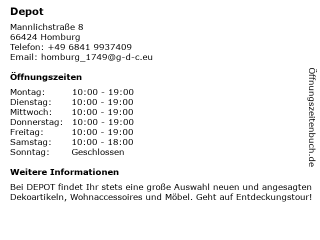 | Öffnungszeiten Depot in Homburg anzeigen | |