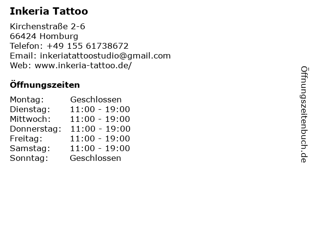 | Öffnungszeiten Inkeria Tattoo in Homburg anzeigen | |
