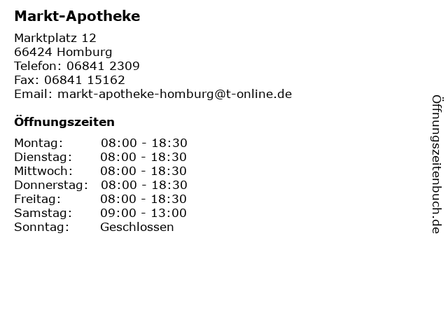 | Öffnungszeiten Markt-Apotheke in Homburg anzeigen | |