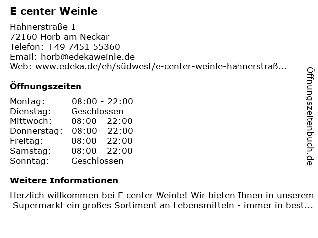 | Öffnungszeiten E center Weinle in Horb am Neckar anzeigen | |