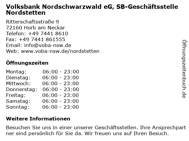 1 Berthold-Auerbach-Museum im Schloss Nordstetten (Entfernung: 0,04 km) Ritterschaftsstraße 6, 72160 Horb Am Neckar 3 Berthold-Auerbach-Schule - Grundschule Nordstetten - Sekretariat (Entfernung: 0,45 km) Schulstr. 20, 72160 Horb 4 5 Volksbank Hohenzollern-Balingen eG, Filiale Haigerloch (SB-Center) (Entfernung: 10,66 km) Hohenbergstraße 2-4, 72401 Haigerloch 6 Volksbank Nordschwarzwald eG - SB-Filiale Schornzhardt (Entfernung: 14,85 km) Dieselstraße 5/1, 72285 Pfalzgrafenweiler |