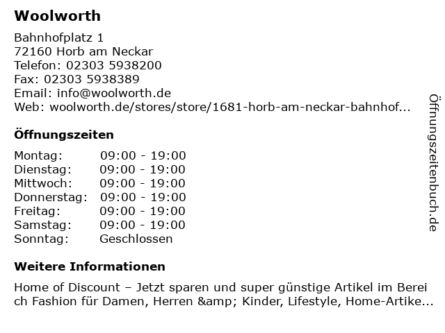 | Öffnungszeiten Woolworth in Horb am Neckar anzeigen | |