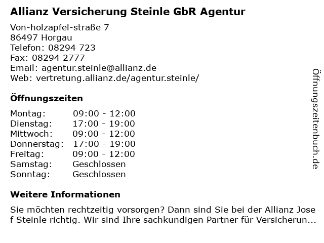 1 Allianz Versicherung Dominik Steinle Generalvertretung (Entfernung: 0,01 km) Von-holzapfel-straße 7, 86497 Horgau 4 Praxis für Zahnmedizin und Oralchirurgie Dr. med. dent. Christian Steinle (Entfernung: 15,66 km) Bahnhofstraße 16, 86150 Augsburg 6 |