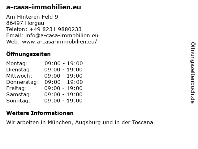 | Öffnungszeiten a-casa-immobilien.eu in Horgau anzeigen | |