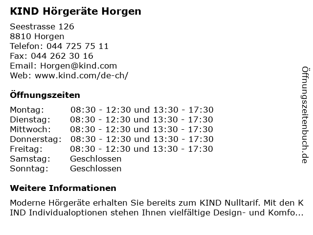 | Öffnungszeiten KIND Hörgeräte Horgen in Horgen anzeigen | |