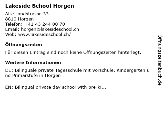 | Öffnungszeiten Lakeside School Horgen in Horgen anzeigen | |