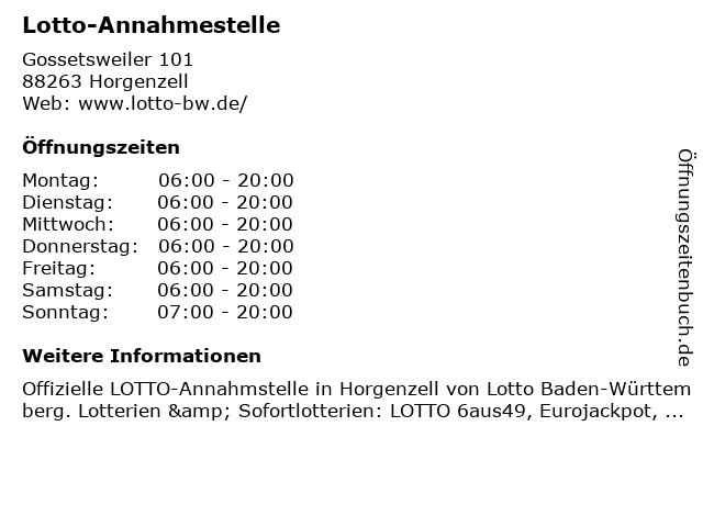 | Öffnungszeiten Lotto-Annahmestelle in Horgenzell anzeigen | |