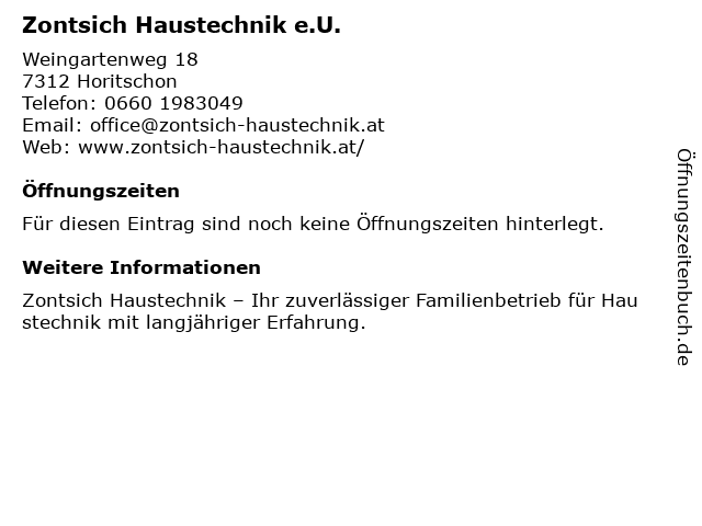 | Öffnungszeiten Zontsich Haustechnik e.U. in Horitschon anzeigen | |