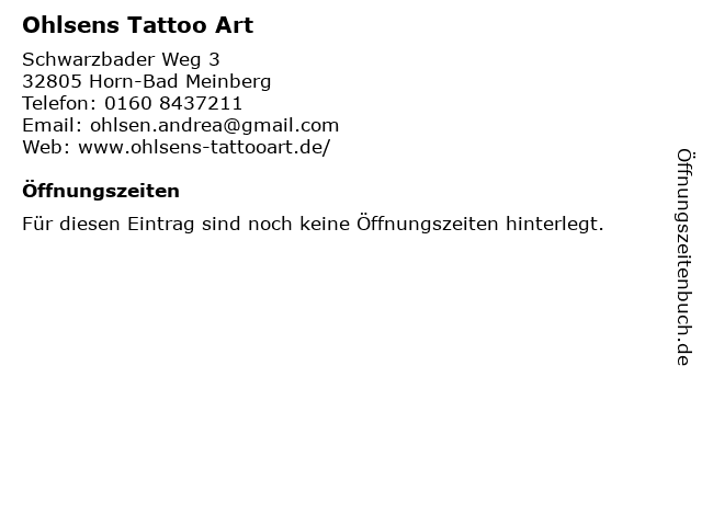 | Öffnungszeiten Ohlsens Tattoo Art in Horn-Bad Meinberg anzeigen | |