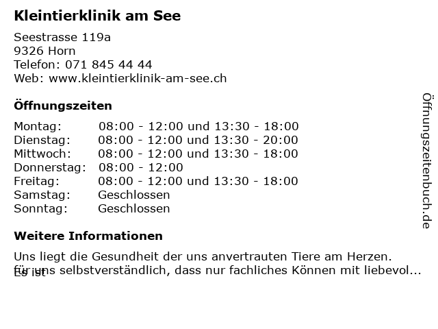 | Öffnungszeiten Kleintierklinik am See in Horn anzeigen | |