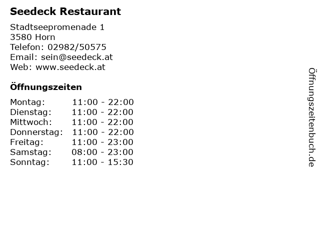 | Öffnungszeiten Seedeck Restaurant in Horn anzeigen | |
