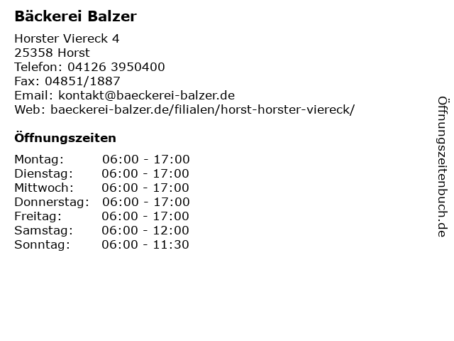 | Öffnungszeiten Bäckerei Balzer in Horst anzeigen | |