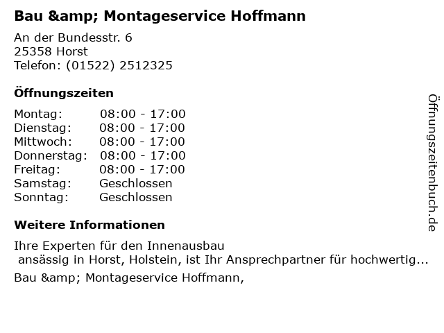 | Öffnungszeiten Bau & Montageservice Hoffmann in Horst anzeigen | |