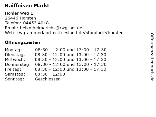 | Öffnungszeiten Raiffeisen Markt in Horsten anzeigen | |