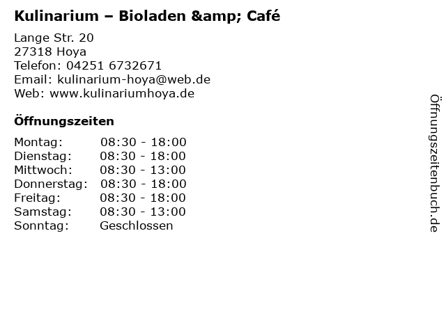 | Öffnungszeiten Kulinarium – Bioladen & Café in Hoya anzeigen | |