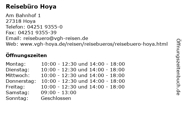 | Öffnungszeiten Reisebüro Hoya in Hoya anzeigen | |