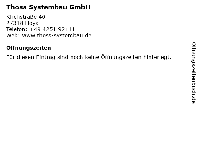 | Öffnungszeiten Thoss Systembau GmbH in Hoya anzeigen | |