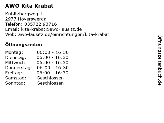 | Öffnungszeiten AWO Kita Krabat in Hoyerswerda anzeigen | |