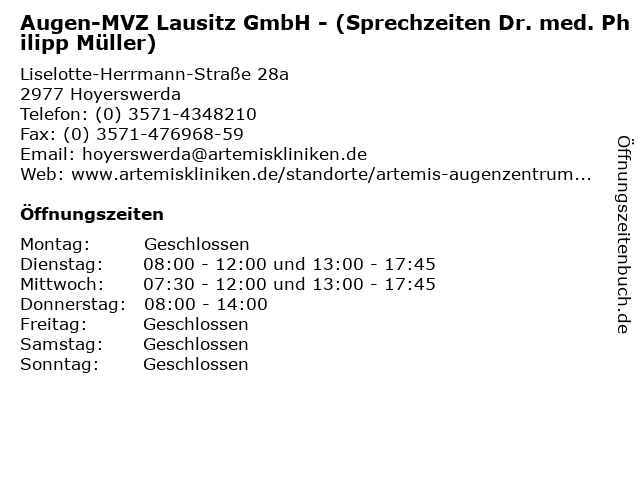 Branchen & Suchbegriffe zu Augen-MVZ Lausitz GmbH - (Sprechzeiten Dr. med. Philipp Müller):augen, dr., jugendmedizin, kinder, klinik, krankenhaus, lausitz, med., medizin, mvz, müller, philipp, praxis, sprechzeiten, therapie, univ. |