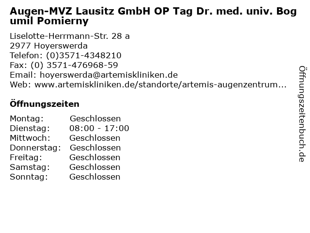1 Augen-MVZ Lausitz GmbH - (Sprechzeiten Dr. med. Philipp Müller) (Entfernung: 0,00 km) Liselotte-Herrmann-Straße 28a, 02977 Hoyerswerda 2 Augen-MVZ Lausitz GmbH (OP Tage Hr. Mewas) (Entfernung: 0,00 km) Liselotte-Herrmann-Str. 28 a, 02977 Hoyerswerda 3 Augen-MVZ Lausitz GmbH ( Sprechzeiten PD Dr. med. habil. Gregor Wollensak) (Entfernung: 0,00 km) Liselotte-Herrmann-Str. 28 a, 02977 Hoyerswerda 4 MVZ Augen Medizinisches Versorgungszentrum Lausitz GmbH (Entfernung: 0,11 km) Liselotte-Herrmann-Str. 28a, 02977 Hoyerswerda 5 MVZ Med. Versorgungszentrum Augen MVZ Lausitz GmbH (Entfernung: 1,82 km) Kirchstr. 11, 02977 Hoyerswerda 6 MVZ Medizinisches Versorgungszentrum Poliklinik Spremberg GmbH (Entfernung: 15,30 km) Karl-Marx-Str. 80, 03130 Spremberg |