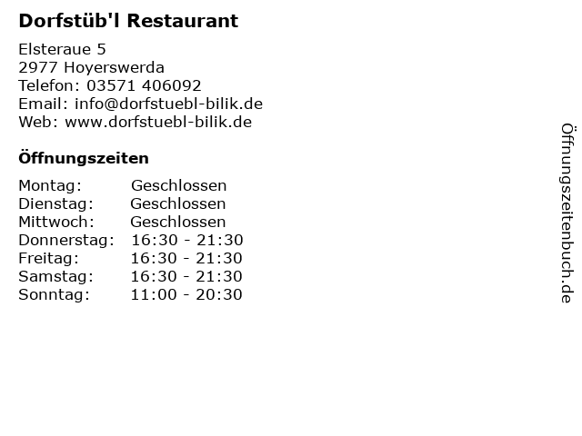 | Öffnungszeiten Dorfstüb'l Restaurant in Hoyerswerda anzeigen | |