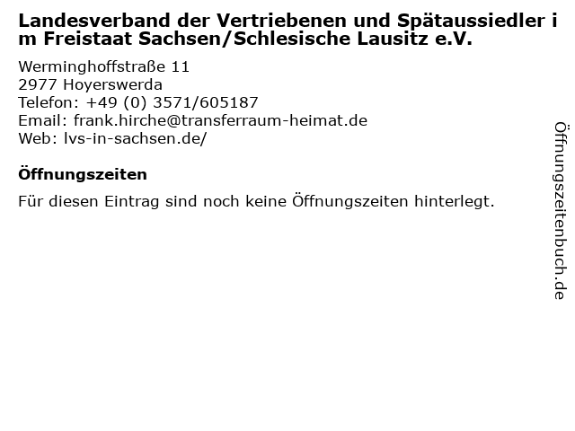 | Landesverband der Vertriebenen und Spätaussiedler im Freistaat Sachsen/Schlesische Lausitz e.V. anrufen | |
