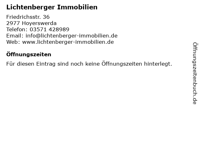 | Öffnungszeiten Lichtenberger Immobilien in Hoyerswerda anzeigen | |
