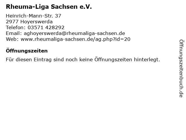 | Öffnungszeiten Rheuma-Liga Sachsen e.V. in Hoyerswerda anzeigen | |