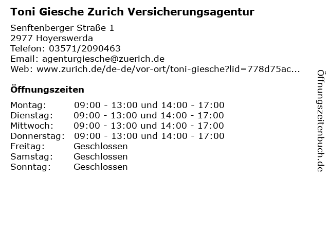 Branchen & Suchbegriffe zu Toni Giesche Zurich Versicherungsagentur:agentur, giesche, toni, versicherung, versicherungsagentur, versicherungsvertreter, zurich |