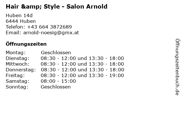 | Öffnungszeiten Hair & Style - Salon Arnold in Huben anzeigen | |