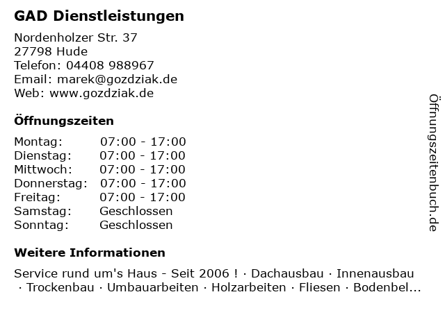 | Öffnungszeiten GAD Dienstleistungen in Hude anzeigen | |