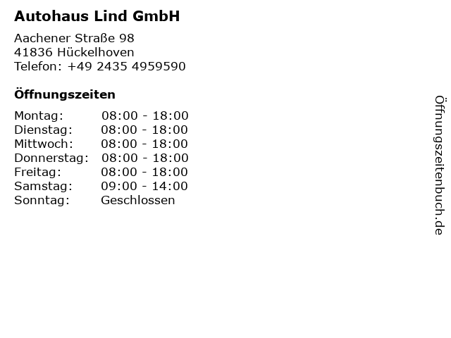 | Öffnungszeiten Autohaus Lind GmbH in Hückelhoven anzeigen | |