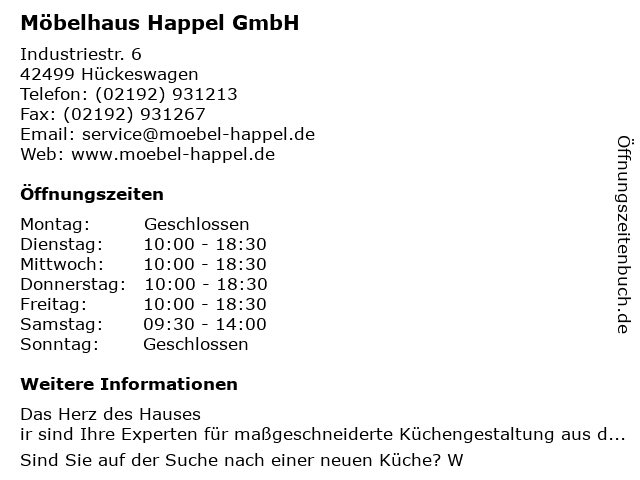 | Öffnungszeiten Möbelhaus Happel GmbH in Hückeswagen anzeigen | |