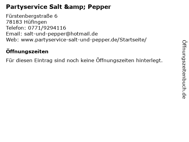 | Öffnungszeiten Partyservice Salt & Pepper in Hüfingen anzeigen | |