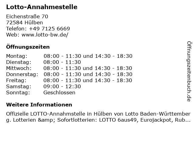 | Öffnungszeiten Lotto-Annahmestelle in Hülben anzeigen | |