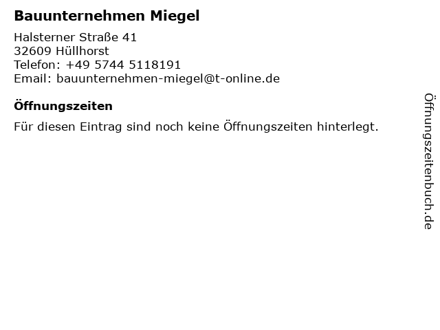 | Öffnungszeiten Bauunternehmen Miegel in Hüllhorst anzeigen | |