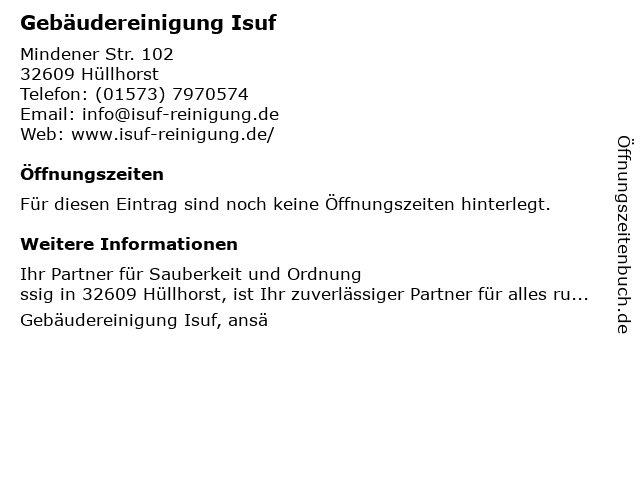 | Öffnungszeiten Gebäudereinigung Isuf in Hüllhorst anzeigen | |