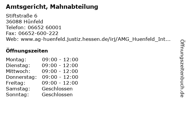 | Öffnungszeiten Amtsgericht, Mahnabteilung in Hünfeld anzeigen | |