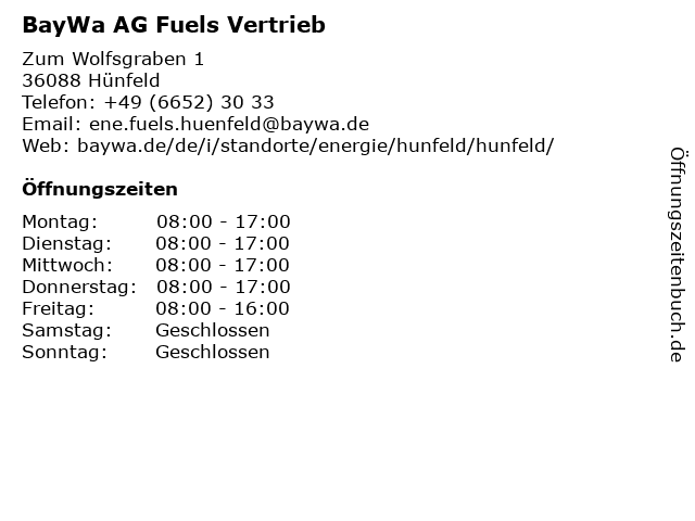 | Öffnungszeiten BayWa AG Fuels Vertrieb in Hünfeld anzeigen | |
