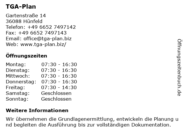 | Öffnungszeiten TGA-Plan in Hünfeld anzeigen | |